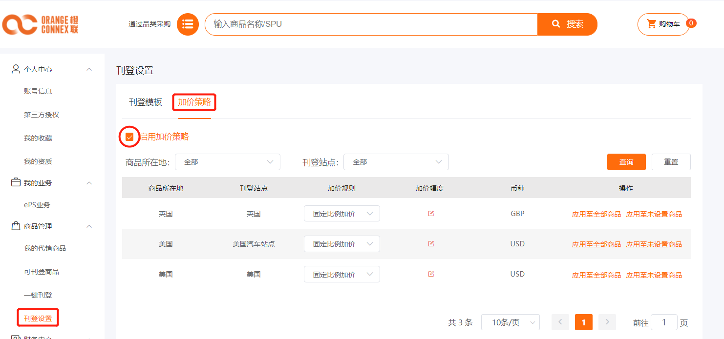 • 登录由橙联提供的橙e供应链平台,进入商品管理》刊登设置》加价策略,点击‘启用加价策略’,在页面下方可按‘固定比例加价’或‘固定值加价’
