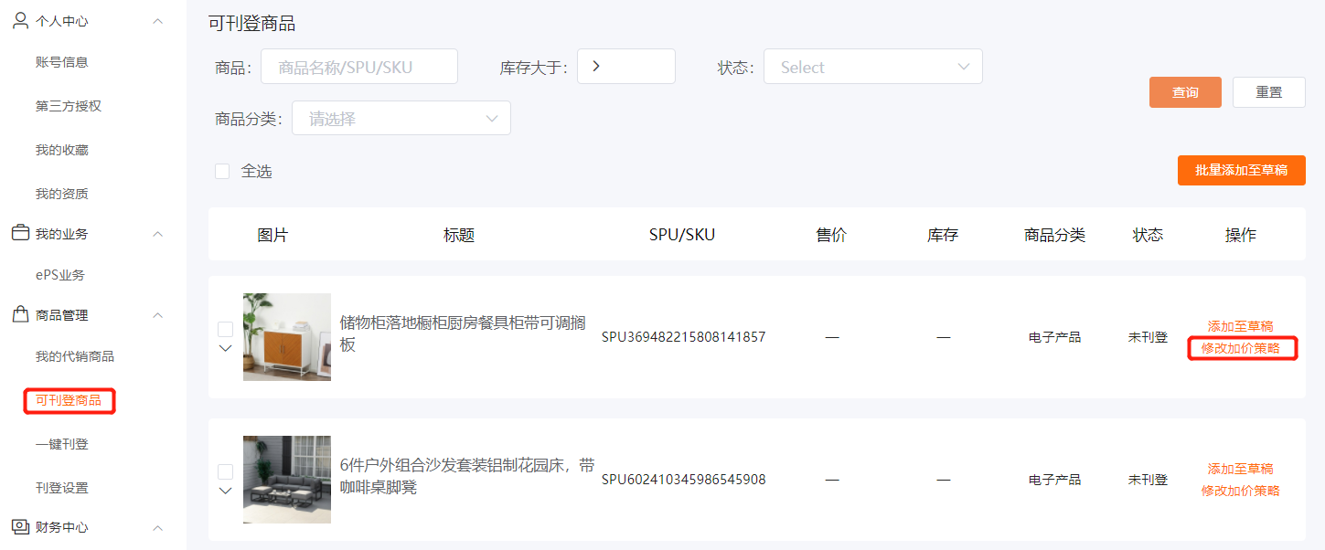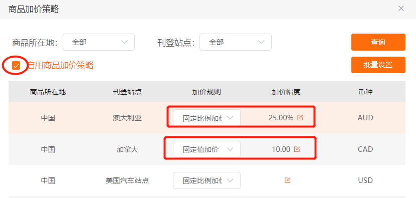 • 点击商品管理》可刊登商品》修改商品加价策略,点击‘启用加价策略’,在页面下方可按‘固定比例加价’或‘固定值加价’