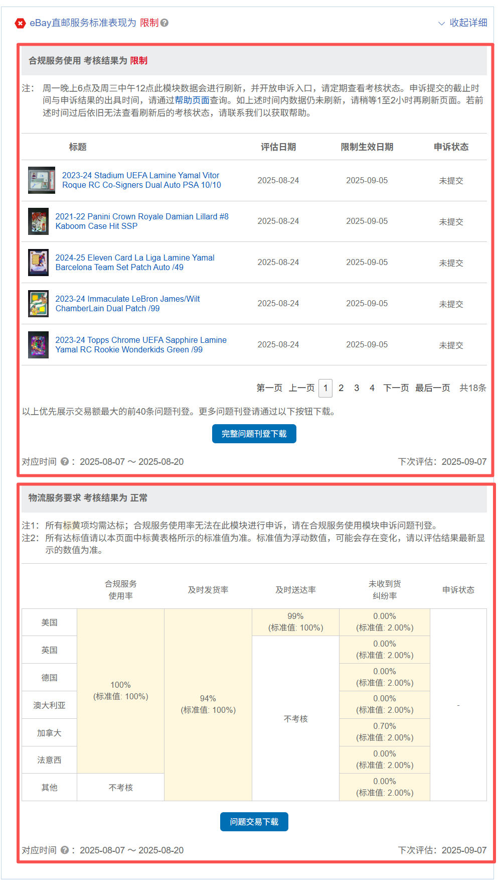 具体申诉节点,卖家可以在“政策中心”的帮助页面中查询。请注意,eBay直邮服务标准两周考核一次,申诉时间节点与其他的政策存在差异。考核开始时间请参考“合规服务使用” 模块上的“评估日期”。