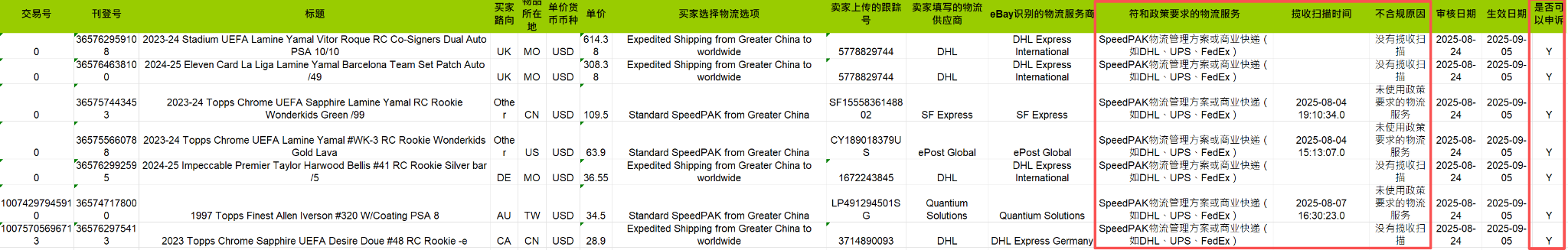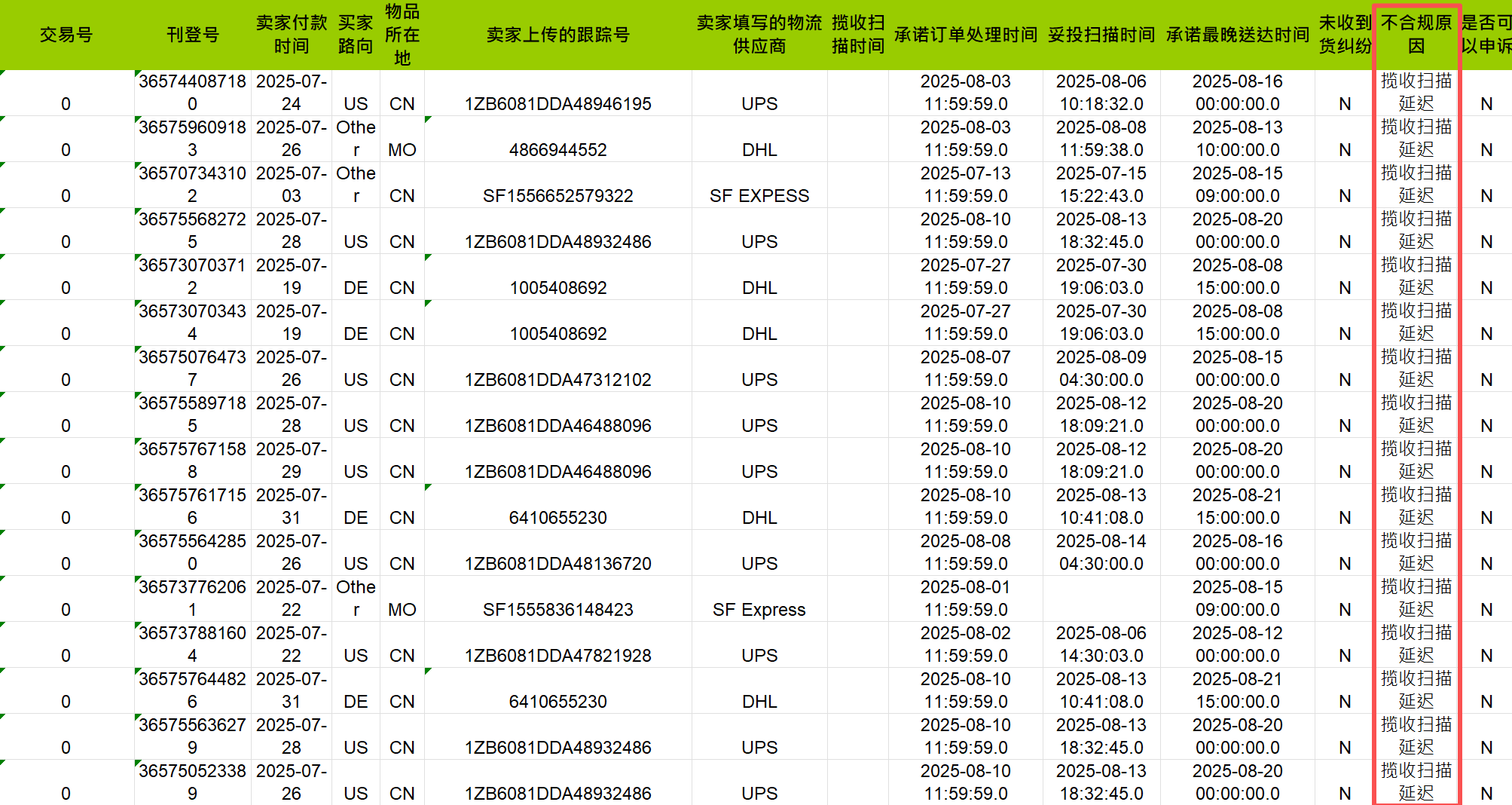 请参考“符合政策要求的物流服务” 确认eBay对于订单要求使用的物流服务,揽收扫描时间,确认eBay是否有正确获取追踪单号的揽收时间,以及不合规原因确认交易被判定为不合规的原因。“是否可以申诉”栏位提示该交易是否可以进行申诉,不可申诉交易无法提交申诉。