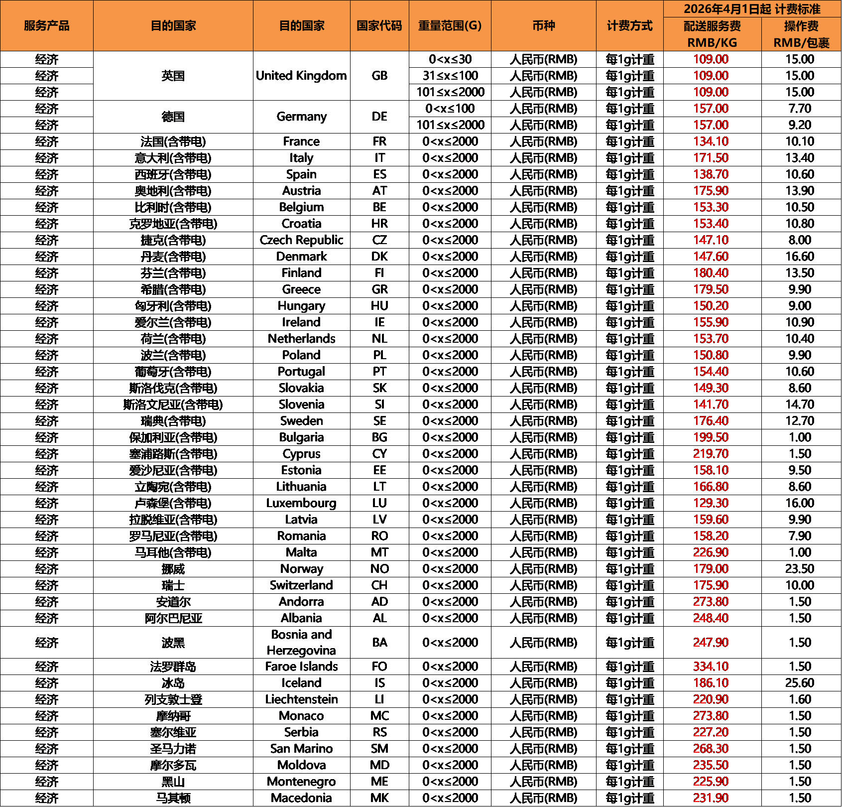 * 以上各国标准服务价卡也适用于各国标准型带电包裹,如有变更,另行通知。