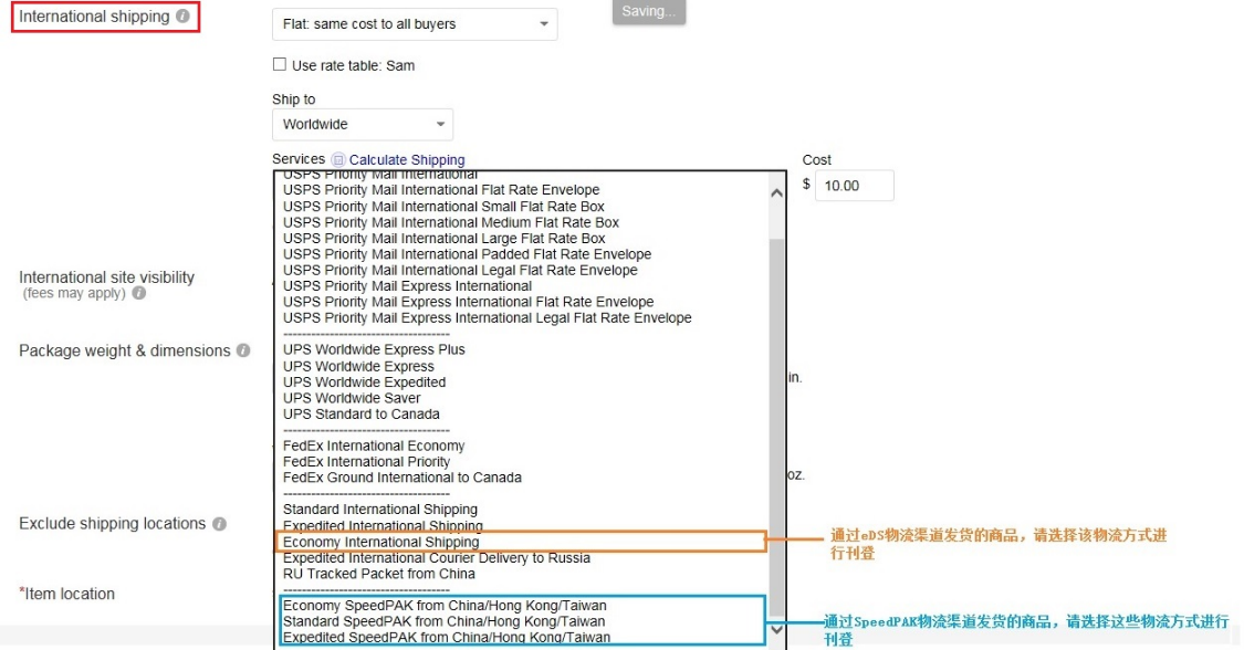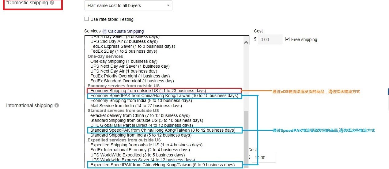 3) 通过eDS物流渠道发货的商品,请选择Economy Shipping from outside US(以 美国站点为例)
