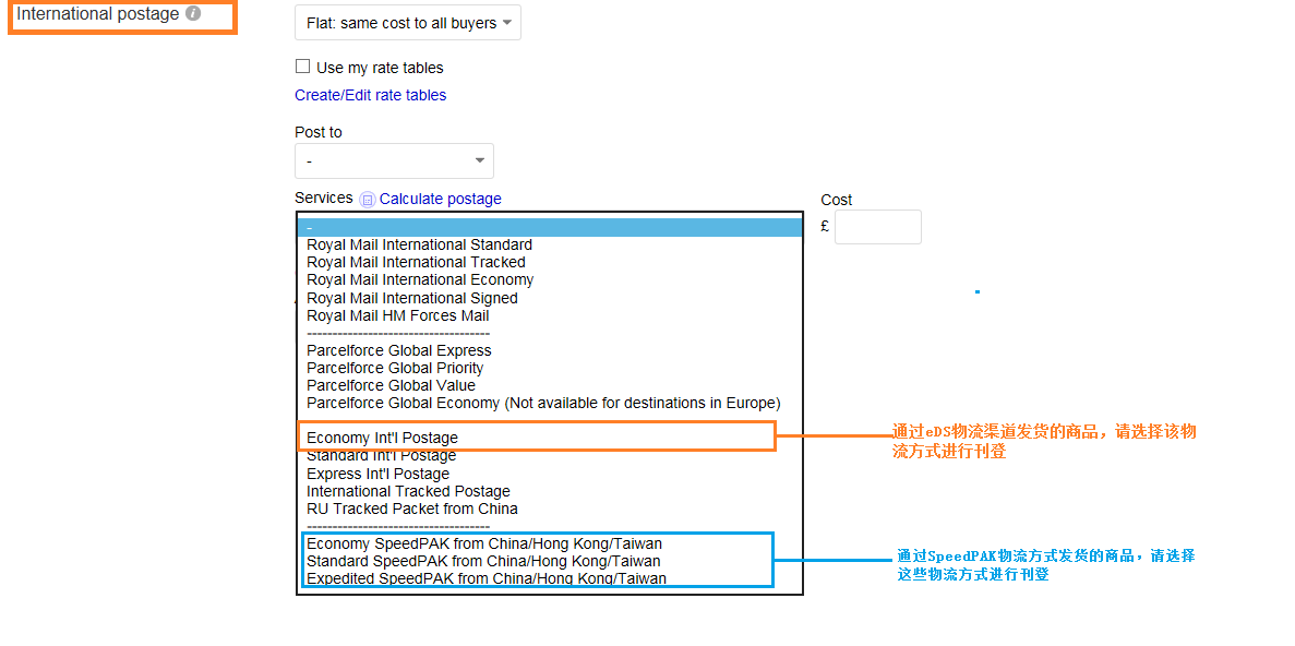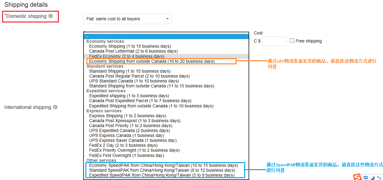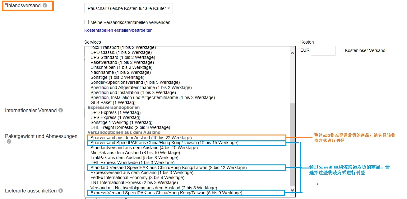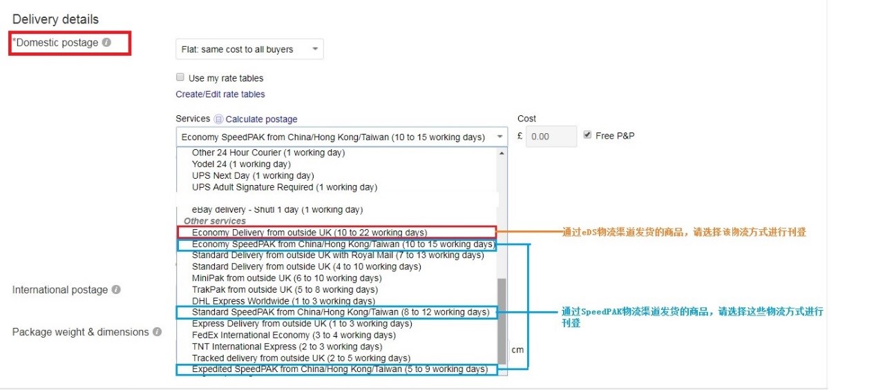 1) 如果您之前在英国、德国站点的商品刊登选择的是Economy Shipping from China/Hong Kong/Taiwan to Worldwide(11 to 35 business days),并且已决定通过SpeedPAK渠道发货,则无需调整物流方式选项。
