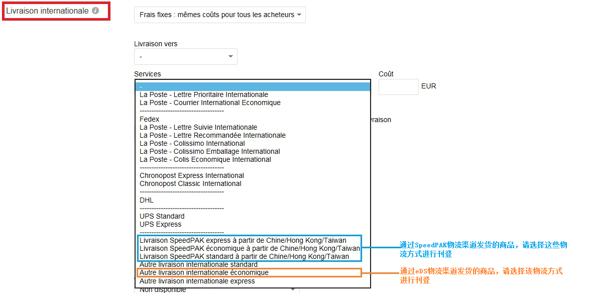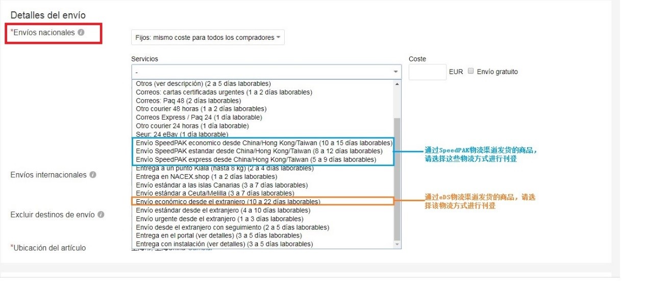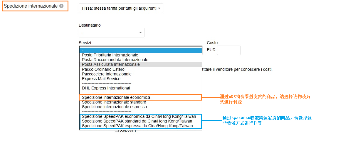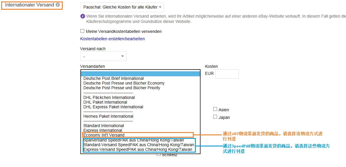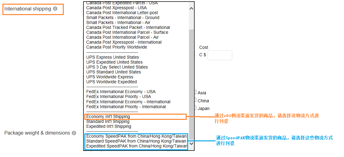 1) 如果您之前在英国、德国站点的商品刊登选择的是Economy Shipping from China/Hong Kong/Taiwan to Worldwide(11 to 35 business days),并且已决定通过SpeedPAK渠道发货,则无需调整物流方式选项。