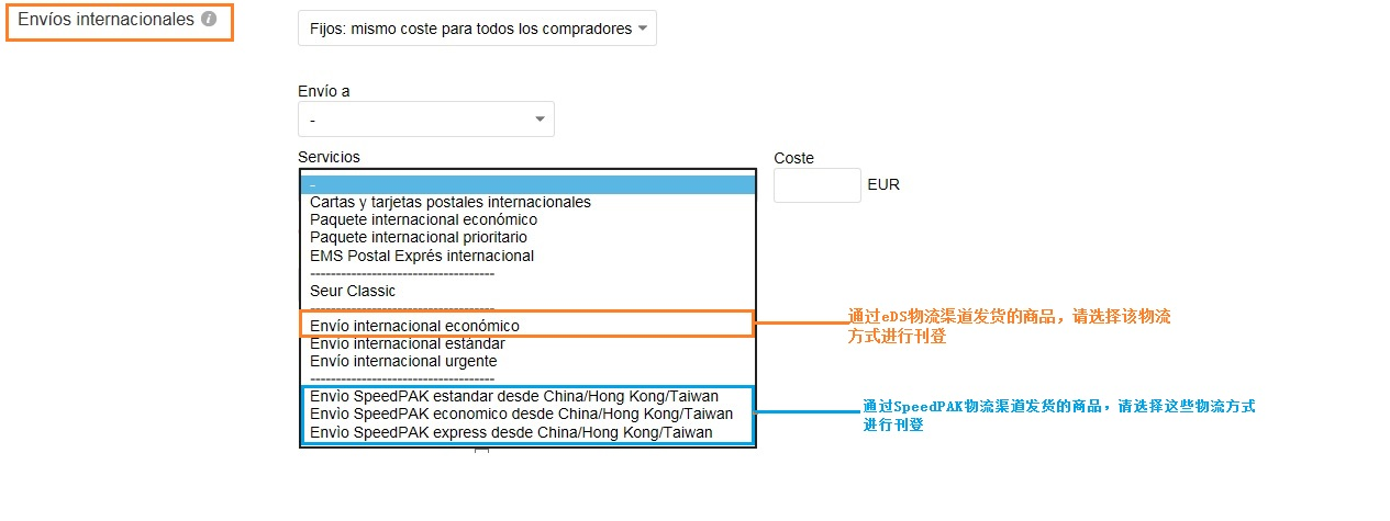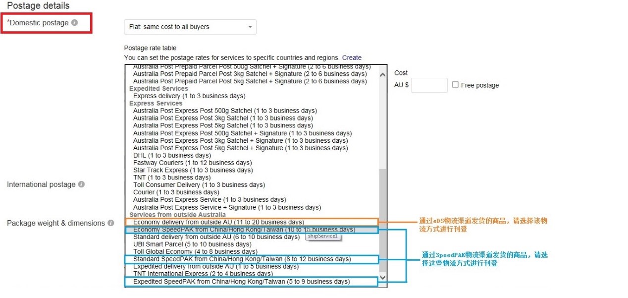 三、 各大站点物流方式选择样例(以SpeedPAK及eDS为例)