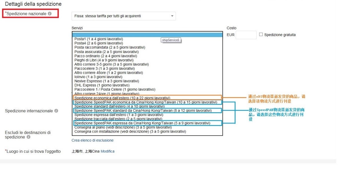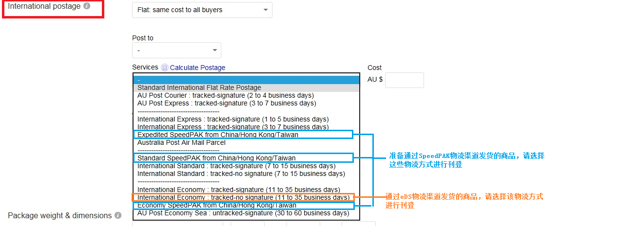 1) 准备通过SpeedPAK物流渠道发货的商品,请选择以下物流方式进行刊登: